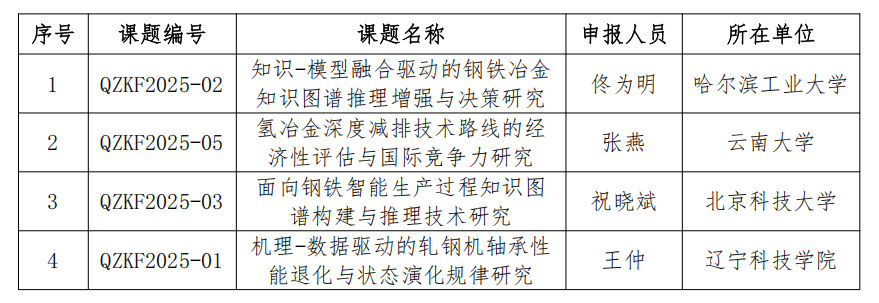 冶金智能制造系統全國重點實驗室2025年度開放課題評審結果公示